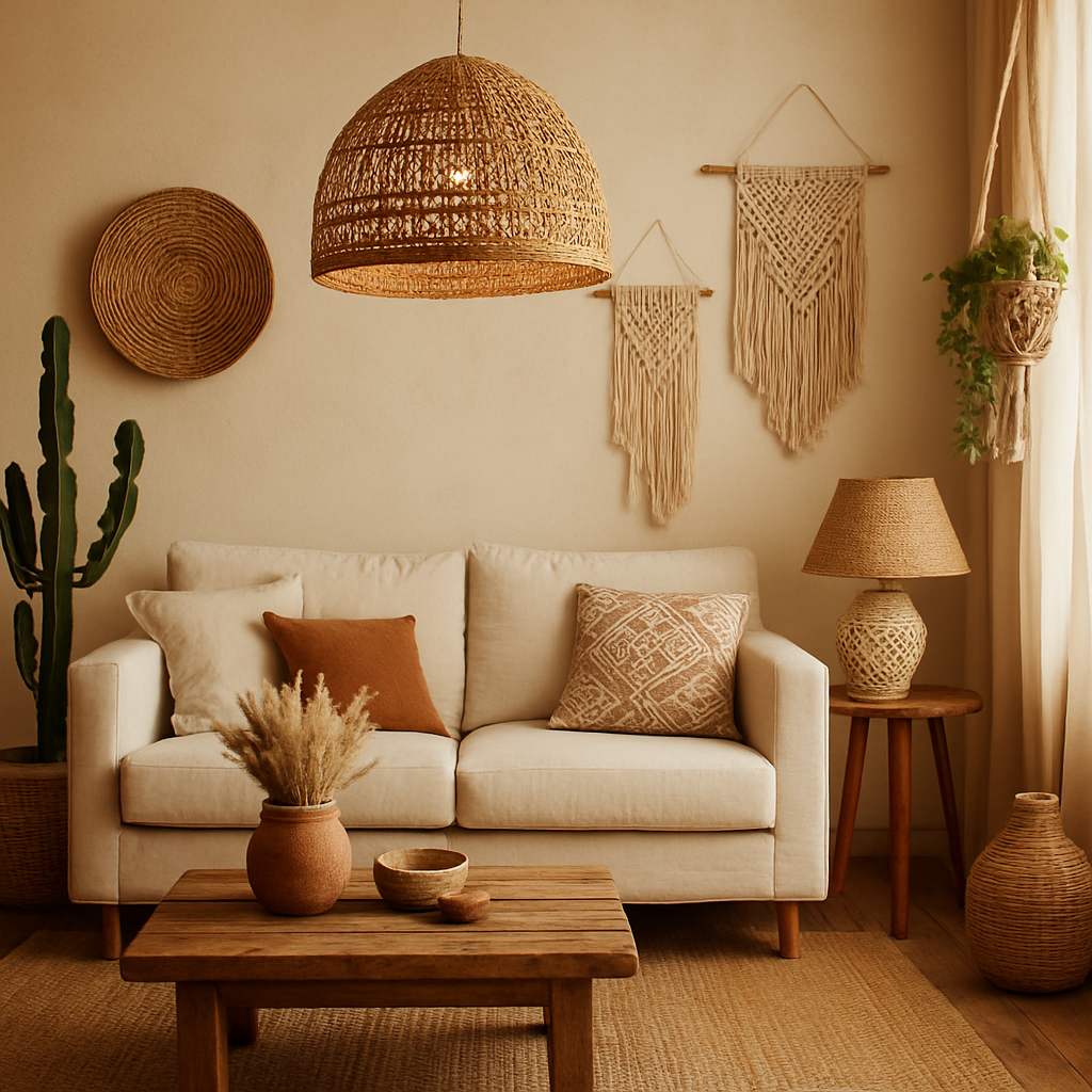 Une ambiance chaleureuse et naturelle, où les matières brutes et organiques sont à l’honneur. Les tons sont doux (beige, sable, terre cuite), les textures variées (jute, macramé, céramique artisanale). Le mobilier est simple et accueillant, avec une dominante de bois clair et de fibres naturelles. L’ensemble invite à la détente et à la rêverie, comme un refuge paisible au cœur du tumulte.